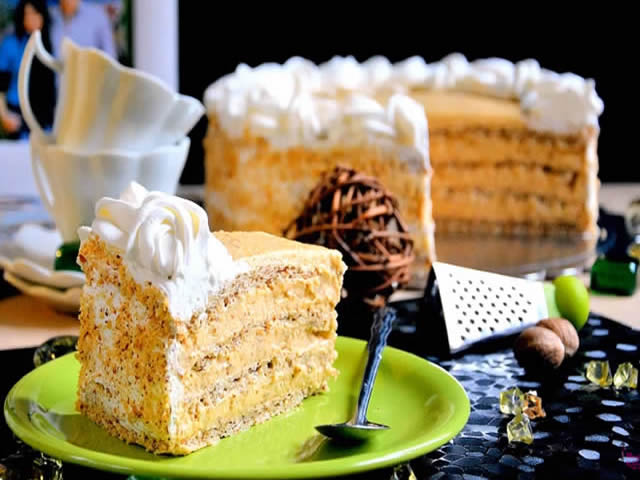 3 belanca umutite sa 3 kašike šećera. Sjedinite 3 kašike mlevenih oraha i 2 kašike brašna, pa dodajte prethodnoj smesi. Na dno pleha vel. 25 cm stavite papir za pečenje. Sipajte pripremljenu smesu i izravnajte. Pecite u zagrejanoj rerni na 200 °C oko 12-13 minuta. Na isti način pripremite i preostala tri patišpanja. Fil: Sjedinite žumanca, brašno i 200 ml mleka. Ostatak mleka i šećer stavite da provri. U provrelo mleko sipajte pripremljenu smesu od žumanaca i skuvajte fil. Sklonite sud sa vatre i preko fila stavite rastegljivu foliju. Ostavite da se skroz ohladi. Izmiksajte maslac i šećer u prahu. Postepeno dodajte ohlađen fil i dobro izmiksajte. Dodajte mlevene orahe i malo muskatnoh oraha. Promešajte i fil podelite na 4 dela. Na tacnu stavite prvi patišpanj i prefilujte ¼ fila. Stavite drugi patišpanj, prefilujte i ponovite postupak sa preostalim korama i filom. Šlag u prahu i hladno mleko dobro umutite, pa dekorišite tortu po želji.