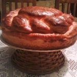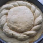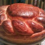 Nadošlo testo ponovo premesiti i podeliti na dva jednaka dela. Od prvog dela razvući pogaču prečnika 24 cm. Drugu polovinu testa ponovo podeliti na pola. Od jedne polovine napraviti pletenicu, a od druge manju pogaču koja se stavi na prvu , a oko nje pletenica.