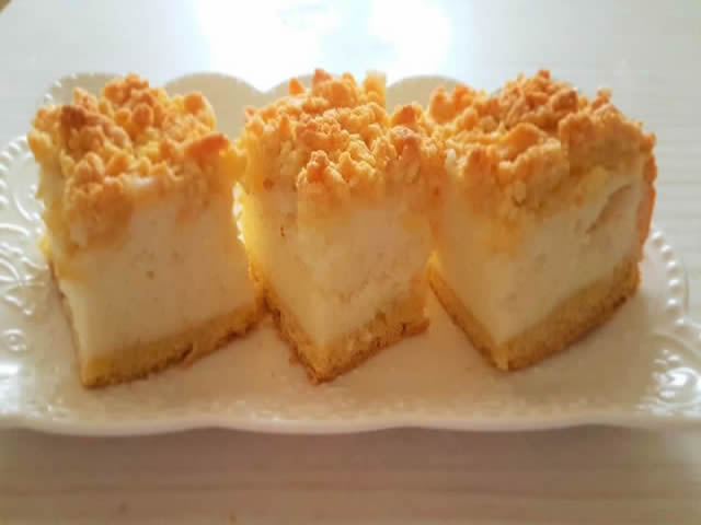 Priprema: Zamesiti testo od navedenih sastojaka i podeliti na dva dela. Jedan deo staviti u zamrzivač i kada se zamrzne izrendati. Fil umutiti od navedenih sastojaka. Prvi deo testa razvaljati i staviti u pleh namazan margarinom. Staviti fil preko testa, a preko izrendano zamrznuto testo. Peći na 200 stepen 30-40 minuta. U nastavku se nalazi video sa detaljnim načinom pripreme. Prijatno!