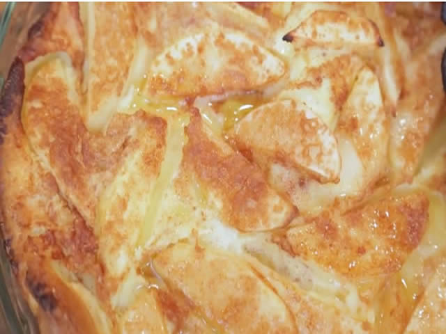 Izvadite posudu iz rerne i prelijete postepeno jabuke prethodno umućenom smjesom od jaja, mlijeka i brašna. Tako prelivenu smjesu pospete prstohvatom smeđeg šećera i cimeta. Vratite u rernu i ostavite 20 minuta da se peče.