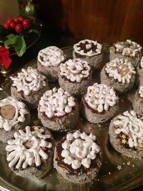 Koru iseci casom.Spajati delove i filovati sa strane, uvaljati u kokos i ukrasiti glazurom gornju stranu.