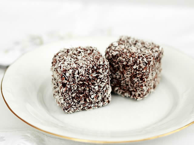 Varjačom lagano umešajte sneg u testo.P relijte smesu i pecite u prethodno zagrejanoj rerni pola sata na 190 stepeni. Ostavite da se ohladi pa isecite na kocke.Za glazuru rastopite čokoladu, šećer i mleko. Kocke uvaljajte u glazuru pa u kokos. Prelijte čokoladne glazure.