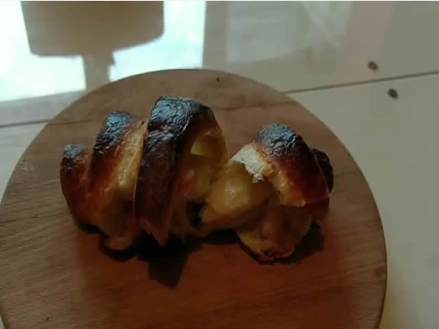 Ugrejte rernu na 230°C, umutite žumance sa malo vode i namažite kroasane, pa ih pecite 10 minuta. Onda smanjite temperaturu na 190°C i pecite još pet minuta, da dobiju zlatnosmeđu boju.