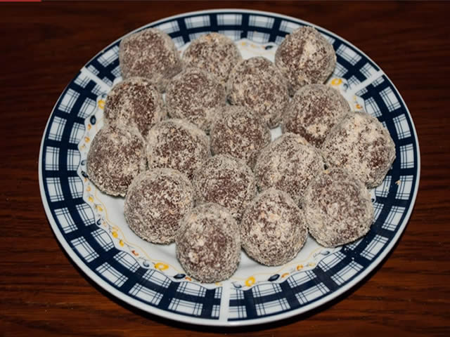 Priprema: 4 kašike vode, 8 kašika šećera, 1 žumance i 1 vanilin šćer staviti u šerpicu i kuvati na pari.Kad počne da se zgušnjava dodati 50 gr putera i 2 kesice pudinga u prahu po ukusu. Sve lepo sjediniti i kuvati još 2 minuta. Masa će biti lepljiva ali ne brinite ostavite da se ohladi 2 sata u frižider. Zatim izmešati i u to dodati 100 gr mlevenog keksa. Oblikovati kuglice, uvaljati ih u mleveni keks.