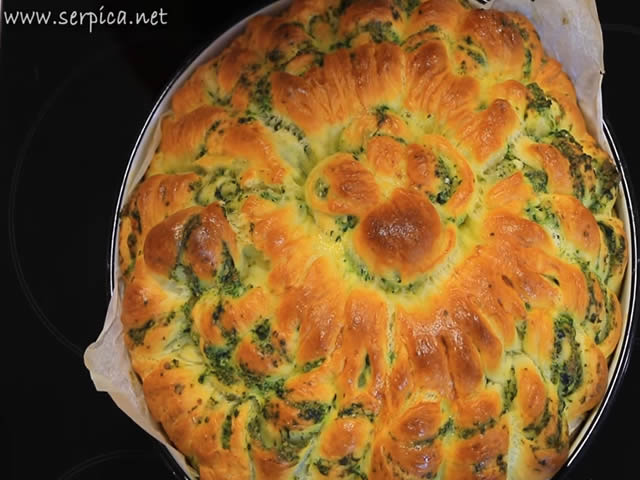 Sastojci i priprema: oko 1 kg. brašna, 40 gr. svežeg kvasca, 200 ml. mlake vode, 300 ml. jogurta, 100 ml. ulja, 1 celo jaje + 2 žumanceta, 2 kašičice soli, 2 kašičice šećera, 300 gr. sitnog sira, 200 gr. spanaća.