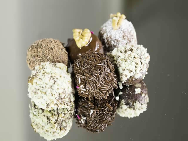 Potrebni sastojci: 70g mlevenih oraha, 70g mlevenih badema, 130g mlevenog keksa, 60g prah šećera, 20g kakao praha, 2 kašike meda, 30ml ruma, 30ml soka od jabuke.