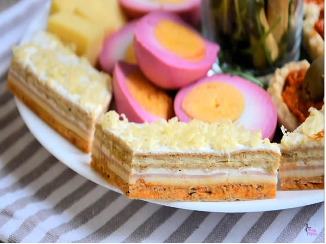 Potrebno: 400 g krem sira, 550 g kisele pavlake, 250 g majoneza, 100 g ajvara, 100 g malidžana, šunka, kačkavalj, 4 lista veće oblande.