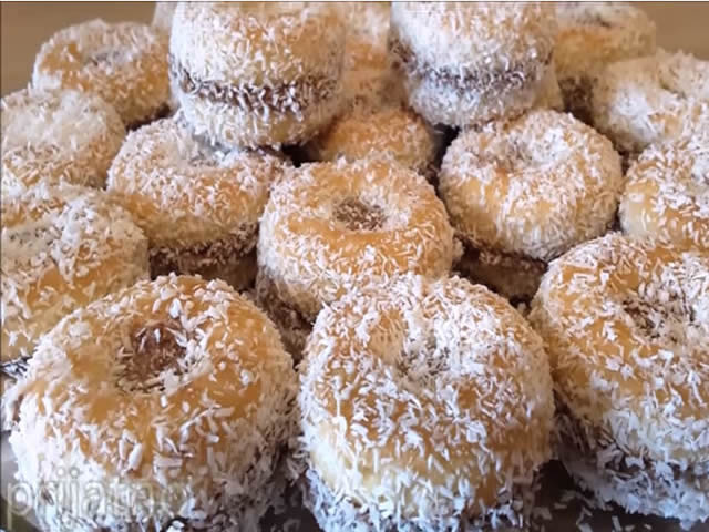 Zatim keks uvaljati u kokosovo brašno ili mljevene orahe, napomena; keks ne namakati mnogo da se ne raspada!
