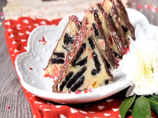 Potrebno: 150 g Oreo keksa, 200 g bele čokolade, 100 g maslaca. 180-200 ml kondezovanog mleka, 70 g kandiranog manga i papaje, 200 g crne čokolade, 2 kašike ulja, malo kokosa (crveno belog).