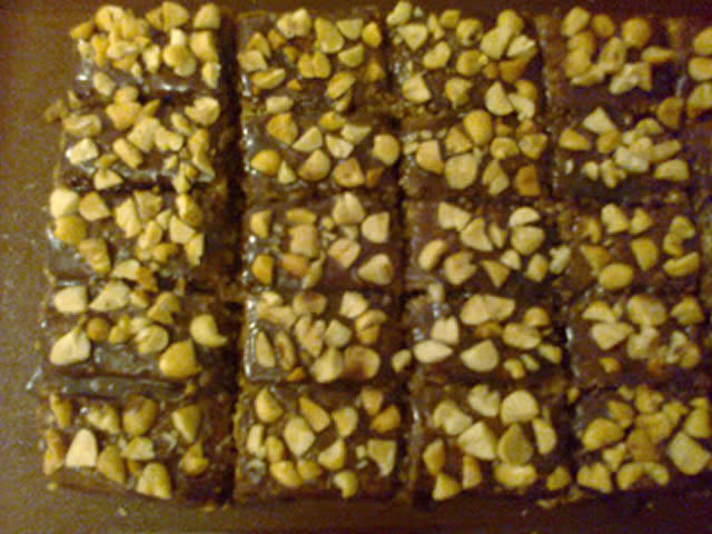U drugu posudu staviti keks, kikiriki i dodati prvu smjesu, dobro uzmjesati izliti na pleh i staviti u frizider na hladno staviti glazuru od cokolade