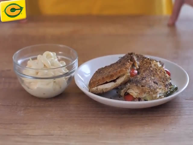 Priprema: Isecite šnicle na trakice, začinite i propržite na ulju. Isecite paprike na trakice i luk očistite i iseckajte. Odvojite koricu od tosta, poređajte meso, gaudu i papriku na hleb, pa zatvorite. Propržite na maslacu i poslužite sa Thomy majonezom.