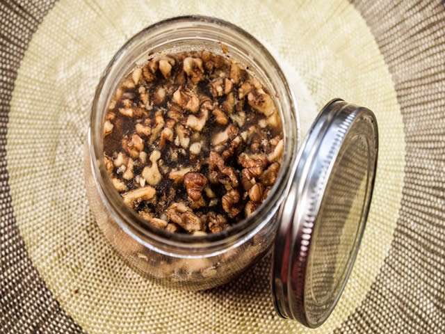 Možete takođe pripremiti lekovitu mešavinu od meda i mladih zelenih oraha. Napominjemo, prilikom uzimanja i seckanja zelenih orasa, koristite rukavice, jer zeleni orasi boje ruke.