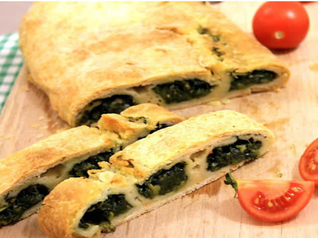 Jedan blok lisnatog testa razvući i iseći na tri trake. Po dužini trake staviti dosta fila, preklopiti stranicama testa. Drugu blok lisnatog testa takođe razvući i staviti ga u podmazanu tepsiju tako da stranice testa malo vire. Odgore složiti rolnice od spanaća i uviti krajeve okolo (kako je prikazano u videu).