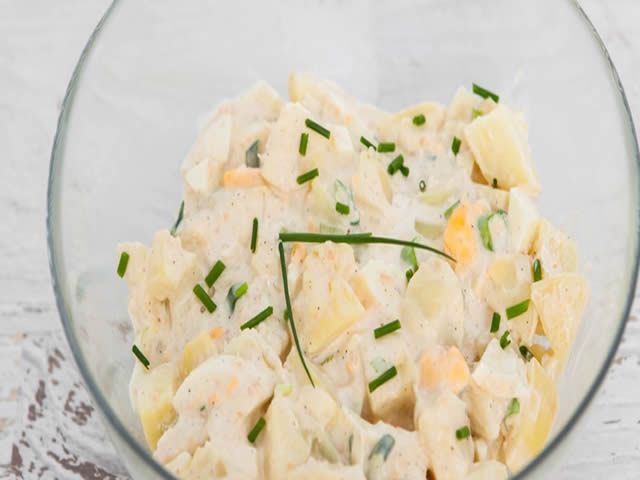 Ohlađeni kuvani krompir iseći na kocke, preliti mešavinom majoneza, senfa, mlevenog celera i seckanog luka.