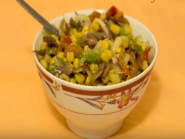 Priprema: Kukuruz staviti u hladnu vodu da se kuva. Skloniti kad provri, procediti i ostaviti da se hladi. Oprane šampinjone seći na listiće, dodati 2 kašičice soli i pržiti na 200 ml ulja na blagoj vatri dok ne uvri voda koju šampinjoni ispuste. Ostaviti da se hladi. Seći praziluk sitno i dodati 1 kašičicu soli. Ispretiskati dobro rukom da bi praziluk bio mekši. Pečene paprike iseckati sitno. Kada se svi sastojci ohlade izmešati ih dobro i salata je gotova.