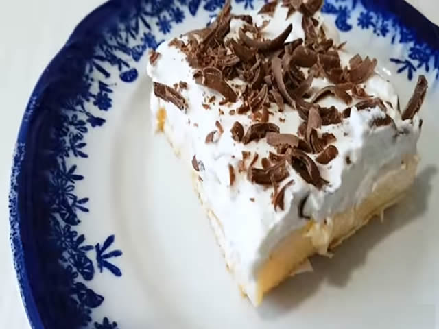 Sastojci: 300g keksa, 1l mleka, 4 zumanca, 1 kasika vanilin secera, 150g secera, 5 kasika brasna, 3 kasike gustina, 500ml slatke pavlake, 100g cokolade.