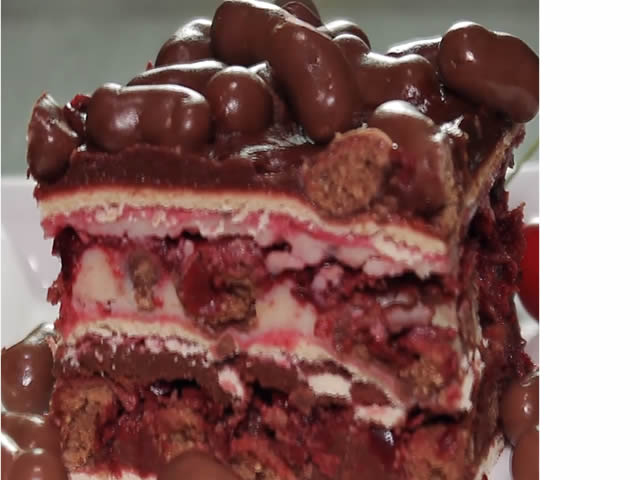 Sastojci: (za 10 osoba), 450gr višanja bez košpica, 1kg krem sira-mascrapone, 300gr šećera u prahu, 14ml arome ruma, 400gr crne čokolade, 400gr bele čokolade, 2 velika pakovanja čoko smokija, pakovanje rozen kora za tortu.