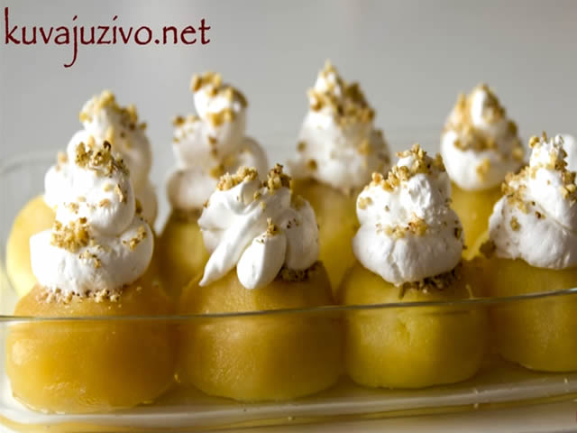 Sastojci: 8 jabuka srednje veličine (1,3kg), 1 litar vode, 500g šećera, sok jednog limuna, 120g mlevenih oraha, 2 kašike šećera u prahu, 70ml mleka, 100g šlaga, 100ml hladne kisele vode, malo mlevenih oraha za dekoraciju.