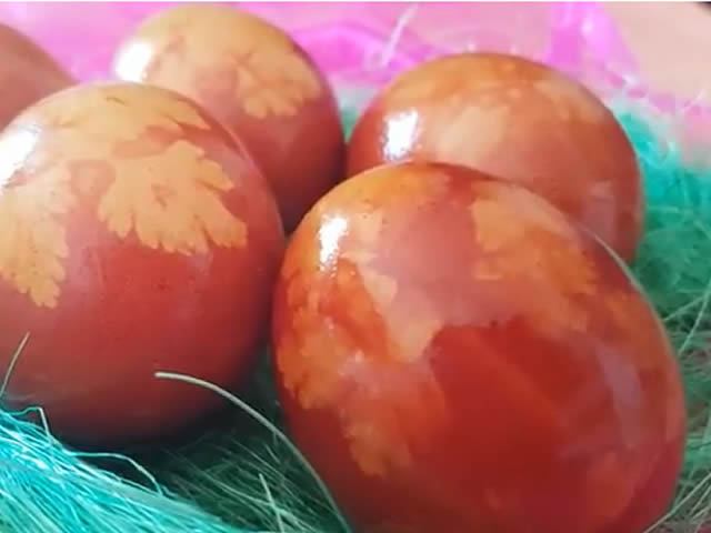 Potrebno za pripremu: ljuske od luka, jaja, najlonske čarape, peršin list ( ili neki drugi listići ), ulje ( za sjaj jaja).