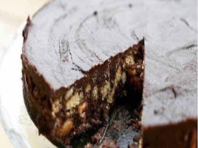 Kad se sve istopi i sjedini preliti keks i orahe, promesati. Smesu naliti u kalup za torte precnika 23cm. Najbolji je kalup gde mu se stranice odvajaju.