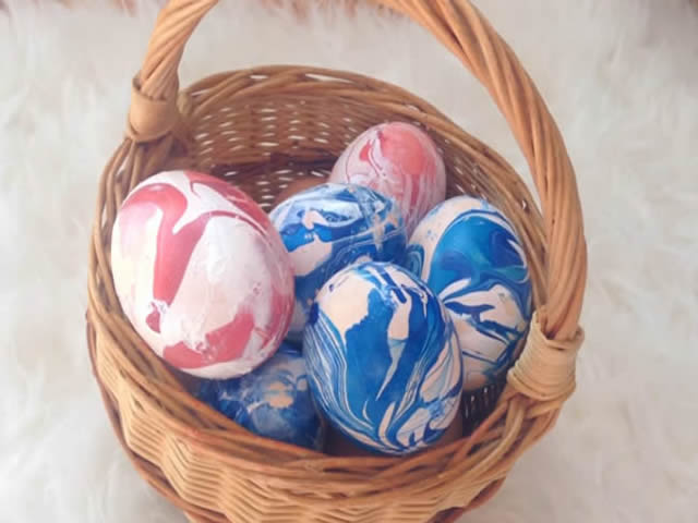 Ovo je jedan od zabavnijih i uspešnijih načina za ukrašavanje uskršnjih jaja. Treba vam nekoliko različitih nijansi laka za nokte, plastična posuda sa vodom, čačkalica i već skuvana jaja. Nakapajte u posudu željene boje laka za nokte, uz pomoć čačkalice napravite šare po izboru i uronite jaje.