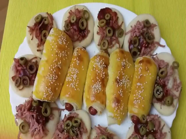 Potrebno je:nadjev po želji ( skuhane viršle, salama, masline ), kečap, origano, susam, ulje