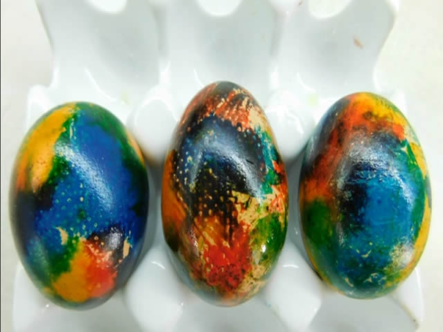 Skuvajte jaja i ohladite do sobne temperature. Raširite belu salvetu i po njoj poprskajte boje po svom ukusu.