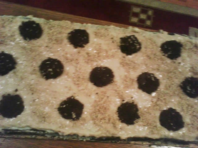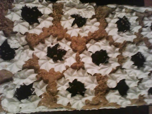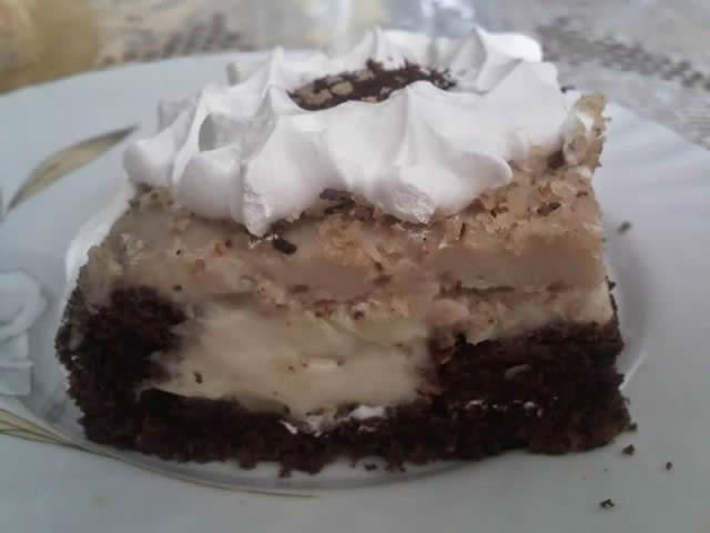 Poravnavati žlicom preko površine biskvita kako bi se sve rupice napunile kremom.Ostaviti kolač po strani pa pripremiti smeđu kremu tako što se u kuhani puding od čokolade doda maslac i ravnomjerno izmješa. Preliti opet toplo preko žute kreme. Ohladiti i poslužiti rezano na kocke.