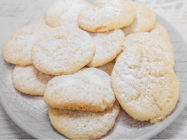 Peci u zarejanoj rerni na 180 stepeni 12-15 minuta. Pecene biskvite posuti secerom u prahu. Prijatno.
