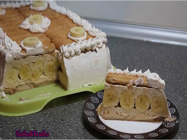 Redjati: piškote umočene u hladno mleko, fil, banane, fil, piškote umočene u mleko, odozgo šlag.