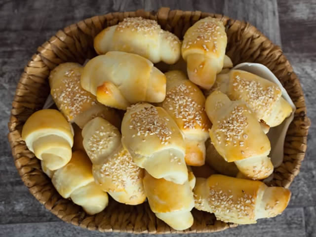 Razviti i iseći na 8 delova. Puniti viršlom, sirom ili ostaviti prazne. Na ovo testo staviti malo margarina i svaku kiflicu uviti. Premazati žumancetom, posuti susamom i peći dok ne porumene.