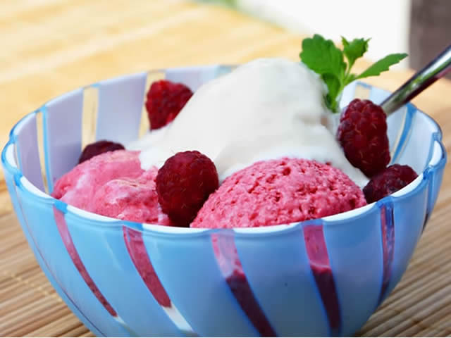 Zamrznute maline izbledamo, zatim varjačom umešamo pavlaku. Ova smesa nije dobro da se muti mikserom, jer se pavlaka razvodni, što kao rezultat daje više kristala leda u sladoledu.