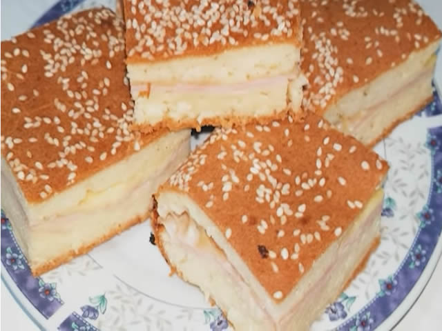 Sastojci: 350g brašna, 2 jaja, pola kašičice soli, 200 ml toplog mleka, 1 kašičica šećera, 20g svežeg kvasca, pola šoljice ulja (oko 60 ml), 150-200g šunke, 200g kačkavalja, susam za posipanje