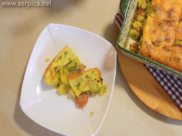 Umutite jaja i pavlaku, dodajte brašno, ulje, vodu, začine, iseckano peršunovo lišće. Ovim prelivom prekrijte povrće i odmah stavite u vrelu rernu da se peče oko 30 – 35 minuta na 230 – 240 stepeni.