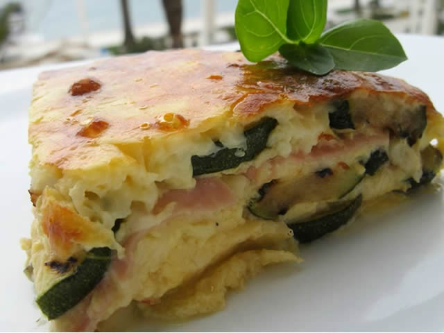Sastojci: 4 veće tikvice, 150 g šunke, 200 g ementalera, 150 g parmezana, 1 jogurt ( čvrsti ), 1 dl mlijeka, 2 žlice brašna, 4 veća jaja, sol, listići svježeg bosiljka ili mente, 2 žlice krušnih mrvica ( za posuti po dnu kalupa) i ulje.