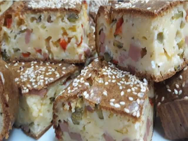 Sastojci: 4 jaja, 1 šolja (2,5 dl) ulja, 1 šolja (2,5 dl) jogurta, 2 šolje brašna, 1 kesica prašak za pecivo, oko 200gr. sira, 150gr. šunkarice, crvena sveza paprika, nekoliko kiseli krastavcici.