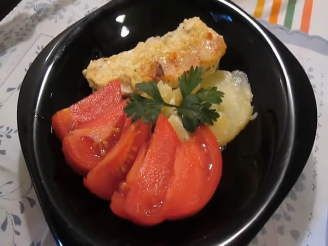 Sastojci: oko 300 do 400g pilećeg belog mesa, 50g otopljenog margarina, 5 kašika pavlake, 1 kašika prezli, 3 čena belog luka / može i više ako volite, krompir prokuvan / u srazmeri sa veličinom vatrostalne činije, vegeta, so, biber ili neki začin po želji.