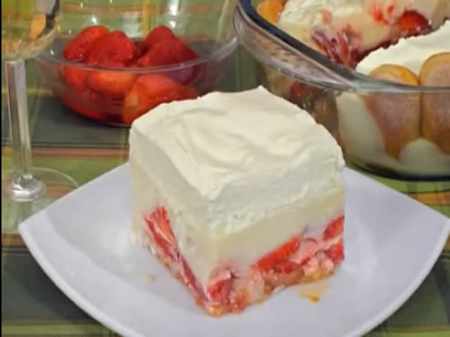 Upute: Jagode očistimo, operemo, prerežemo po pola, stavimo u zdjelu, posipamo šećerom, prelijemo s polovicom količine maraskina i ostavimo da odstoje 30-ak minuta. Za to vrijeme sok od naranče pomiješamo s drugom polovicom maraskina (ako su naranče kiselkaste po želji možemo dodati 1-2 žličice šećera), a u zasebnoj zdjeli istučemo vrhnje. U loncu pripremimo, odnosno, skuhamo nešto rjeđi puding od vanilije. Prikladnu pravokutnu posudu (visine, po prilici, 6-7 centimetara) obložimo piškotama i natopimo ih pripremljenim sokom od naranče. Zatim na njih stavimo jagode, prelijemo još toplim pudingom od vanilije i ostavimo da se malo ohladi. Potom sve zajedno prekrijemo tučenim vrhnjem i stavimo u hladnjak, na najmanje, 3-4 sata da se sastojci prožmu i povežu.