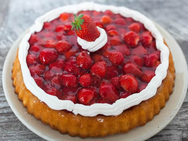 Dok se pita peče, napraviti preliv za tortu: sadržaj kesice pomešati sa dve kašike šećera i uz neprestano mešanje dodavati 2,5dl vode da se ne bi napravile grudvice. Smesu uz neprestano mešanje zagrevati do tačke ključanja (da ne provri).Pečenu pitu izvaditi iz kalupa na tanjir i ostaviti da se hladi. Posuti gustinom i šećerom. Oprane jagode preseći na pola i ređati na testo.