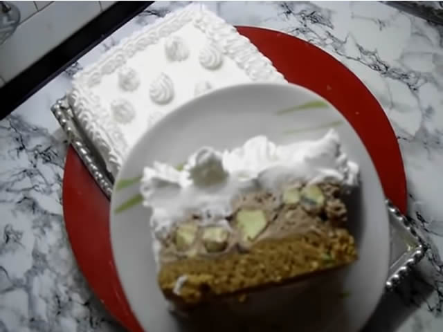 Sastojci: 500 grama mlevenog keksa, 200 grama slaga, 500 mililitra slatke pavlake, 100 grama mlevenih oraha, 100 grama tucenog kikirikija, 10 cokoladnih bananica, 300 grama mesanog kandiranog voca, oko 50 grama seckanih zele bombona, 200 graa cokolde za kuvanje, malo mleka.
