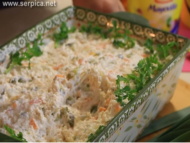 Sastojci i priprema: 4 veća krompira, 3 veće šargarepe, 300 gr. kiselih krastavaca, 1 pile od 2 kg (mogu i komadi mesa), 300 gr. majoneza, 200 gr. kisele pavlake, 1 koren peršuna, 1 manji koren celera, 1 kašičica belog luka u prahu (ne mora), 100 ml. tečnosti iz tegle gde su stajali kiseli krastavci (ili 2 – 3 kašike sirćeta), so, biber.