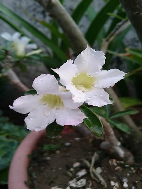 Adenium cveta u rano leto. Cvetovi, slični oleanderu su zvonasti i jarkih boja. Boje cvetova su od tamnocrvene, preko ružičastih nijansi, pa do čiste bele, ili u kombinacijama ovih boja.