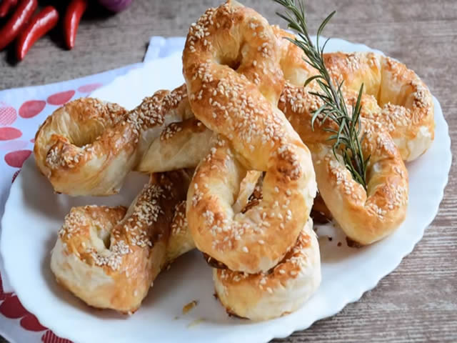 Urolajte, sastavite krajeve i jednu stranu uvrnite tako da dobijete osmicu. Tako pripremljene osmice složite na pleh prekriven papirom za pečenje. Prelijte ostatkom fila, pospite susamom i narendajte puter.
