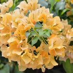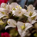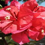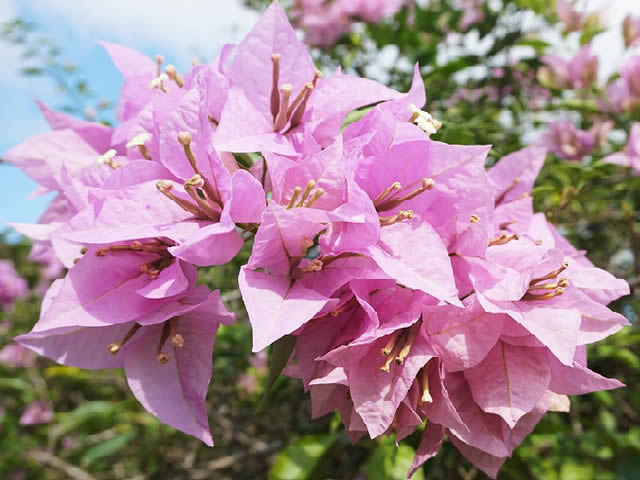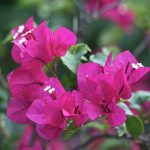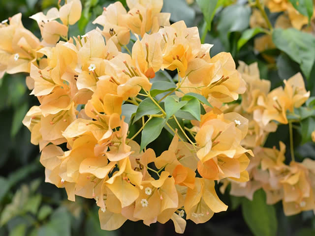 Bugenvilija cveta od juna do kraja oktobra, a u kućnim uslovima u toku leta i rane jeseni. Cvetovi ove prelepe biljke se razvijaju na vrhovima izdanaka. Mali neugledni cvetovi se nalaze unutar velikih brakteja, koje mogu biti različitih boja i veličina. Najkrupnije cvetove ima narandžasta Bugenvilija peruviana, koju nazivaju još i trobojna, jer su njene brakteje crvene boje nalik na ciglu, koja kasnije prelazi u crveno-narandžastu, a pri precvetavanju u ružičasto- naranžastu. Ružičasto-ljubičasta je Bugenvilija glabra. Cvetovi ostalih sorti mogu biti beli, žuti, ružičasti, narandžasti, crveni ili ljubičasti.