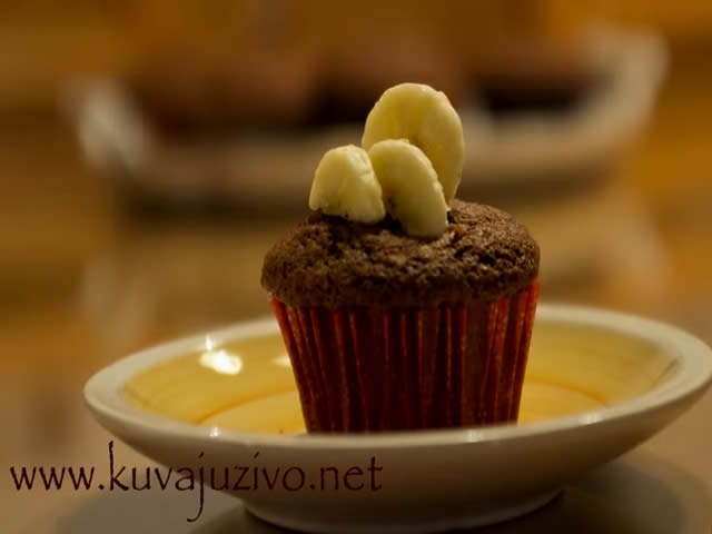Sastojci: 2 jajeta, 1 čaša sećera, 120 gr butera (masti), 2 zrele banane, 2 čaše brašna, 5 gr praška za pecivo, Malo sode bikarbone, 1 čaša čokoladnih mrvica, 2 kašike kakaoa.