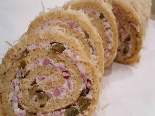 Kada se kora ohladila, polako je odviti iz papira za pečenje. Preko premazati fil i polako uviti, u isto vreme odvajajući koru od papira za pečenje. Ukoliko želite, možete premazati sa malo majoneza i preko posuti rendanim kačkavaljem.