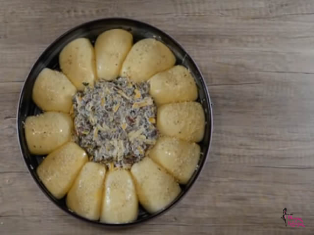 U toplu vodu sipajte kvasac, kasicicu secera i brasna. Ostavite 10 minuta da kvasac proradi, a onda dodajte ulje, so i brasnom zamesite testo. Ostavite 30 minuta. Nakon tog vremena testo podelite na 6 jufki. Svaku jufku posebno razvucite, pa premazite puterom ili margarinom i urolajte. Podelite na pola dela i slazite u krug podmazanog kalupa velicine 26 cm. Ostavite 30 minuta