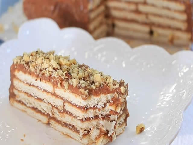 Pripremite manju tepsiju, obložite folijom ili kesom, poređajte 200 gr. keksa, premažite sa dve do tri kutlače fila, opet keks i tako do kraja. Na kraju ne premazujte, već ostavite fila da se posle premaže. Gornji keks premažite malo vodom pa prekrijte folijom ili kesom i držite u frižideru nekoliko sati da se stegne.