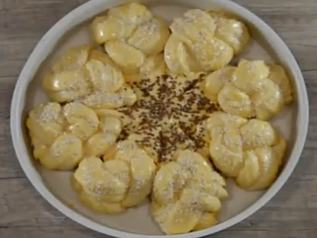 Potrebno:200 ml mleka, 30 g kvasca, 1 kašičica šećer, 2 kašičice soli, 50 ml ulja, 100 g kisele pavlake 20 mm, 2 jajeta, 650 g brašna, puter za premazivanje susam, lan.