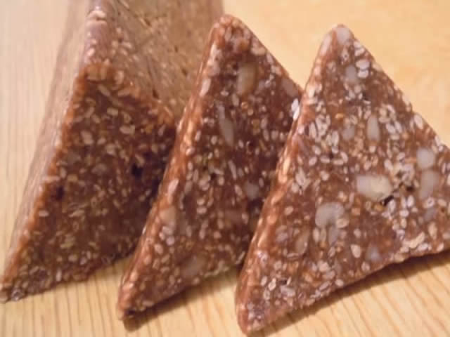 Susam prepeci u suhom tiganju. Izmjesati secer u prahu, margarin i cokoladu te istopiti na laganoj vatri. Skinuti sa vatre, dodati susam, med, mljeveni keks i orahe.